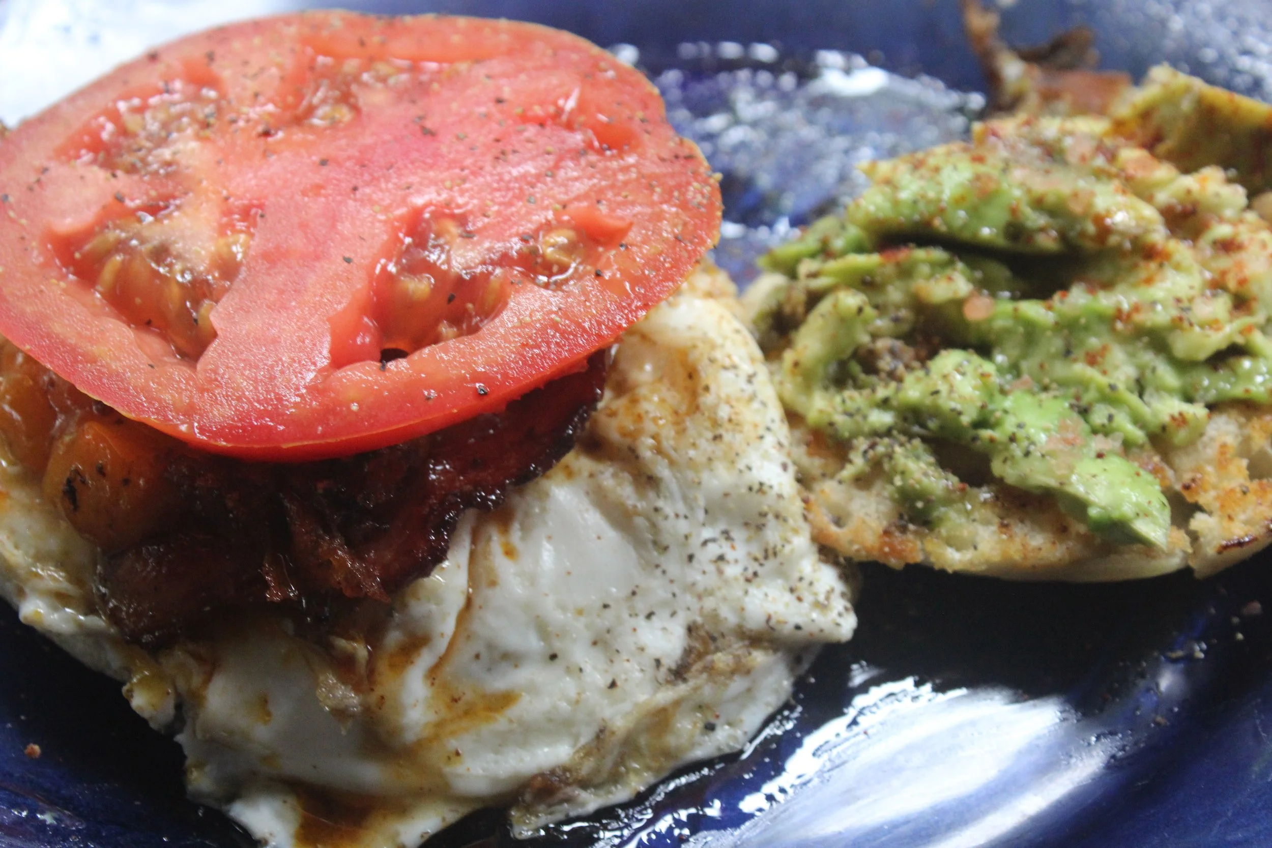 English Muffin with an Over Medium egg, seasoned with delicious candied bacon, topped off with cheese, tomato and avacado. oh and a little bit of syrup.